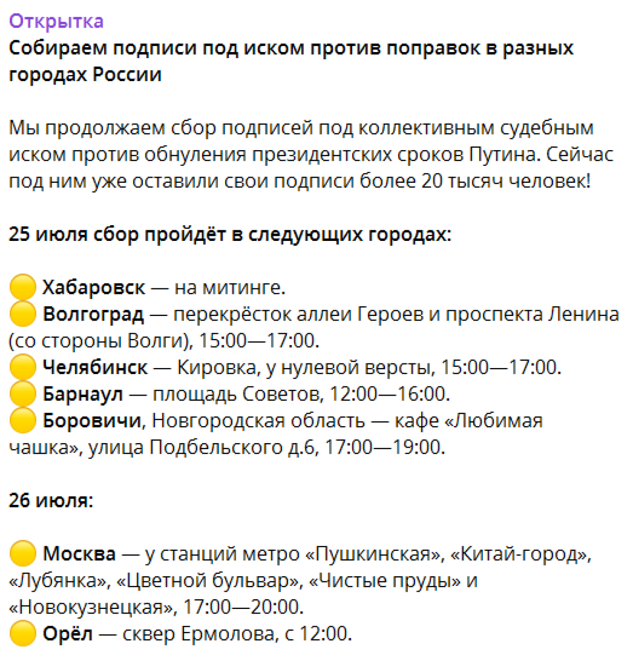 Взяв за моду преступать закон, ходорковцы сначала провели неподобающим образом сбор подписей в Москве, показав совершенно смехотворный результат (5000 подписей на 18 млн жителей из обоих городов). После чего на фоне хабаровских недовольств хотят устроить беспорядки на улицах Волгограда, Челябинска, Барнаула, Боровичей, Орла, Москвы и Хабаровска.