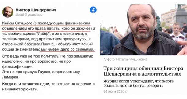 «Мы имеем дело со свиньями», — относительно недавно с пафосом строчил в Мордокнигу любитель матрасов, обличая слуг Режыма. Но — вжух! — и вот уже в полном соответствии с притчей насчёт «свинья видит вокруг себя лишь свиней», самого Шендеровича травят другие неполживые журналистки.