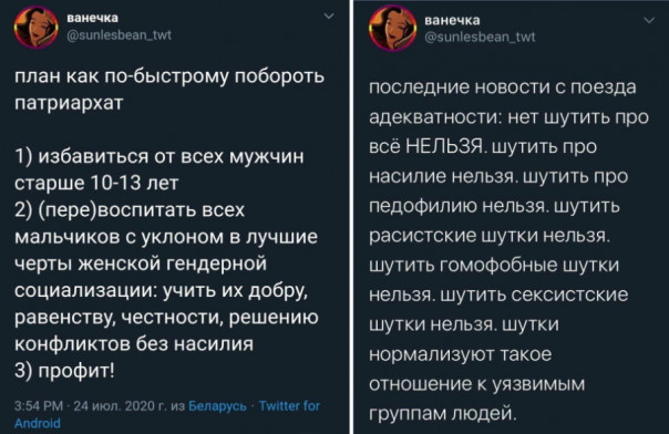 Шутить о физическом уничтожении мужчин, с точки зрения дегенеративного лесбоговна — уместно. Но когда шутки касаются ББПЕ, цвета кожи либо петушиной ориентации, так сразу же включается режим ЭТОДРУГОЕ.