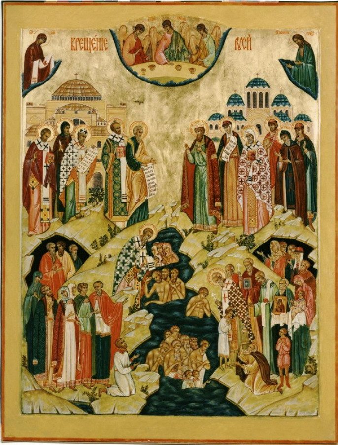 ...И совлек с себя князь наш — вместе с одеждами — ветхого человека, отложил тленное, отряс прах неверия — и вошёл в святую купель. И возродился он от Духа и воды: во Христа крестившись, во Христа облекся; и вышел из купели просветлённый, став сыном нетления, сыном воскресения... Впрочем, на этом не остановился он в подвиге благоверия, но повелел всему народу своему креститься... И тогда осветило землю нашу Солнце Евангелия.