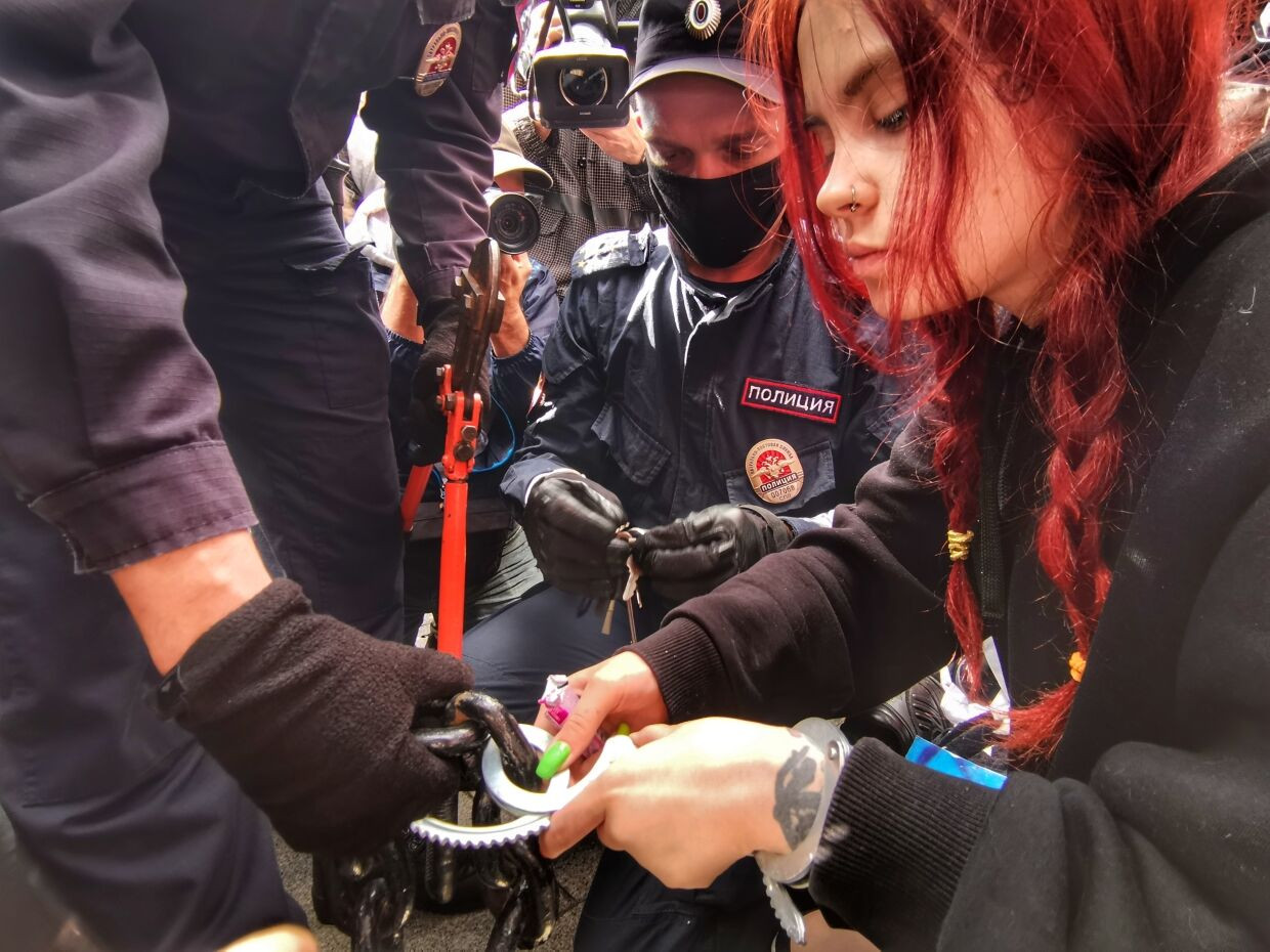А все потому, что сами участники этой акции, пытаясь обратить на себя внимание, вели себя крайне странно: к примеру, какая-то девушка сидела на тротуаре, прикованная к столбу. При этом она никак не реагировала на просьбы сотрудников правоохранительных органов, из-за чего пришлось перекусить наручники болторезом. Кроме того, не слушали правоохранителей и другие участники незаконной акции: самых буйных пришлось арестовать, так как расходиться дебоширы не собирались.