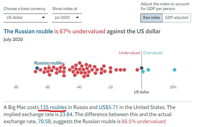 The Economist, как и положено, раз в полгода (в январе и в июле) обновил данные по стоимости биг-мака по странам. В России как было зимой, так и осталось - 135 рублей.