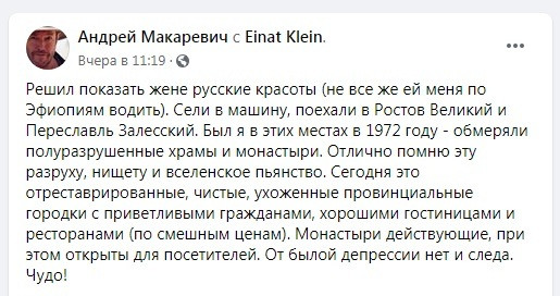 Макаревич, со своей новой израильской женой Эйнат Кляйн, сел в машину и решил посмотреть, напоследок (?), красивое увядание заМКАДной России. Но что-то пошло не так. Итог у него в Фейсбуках: