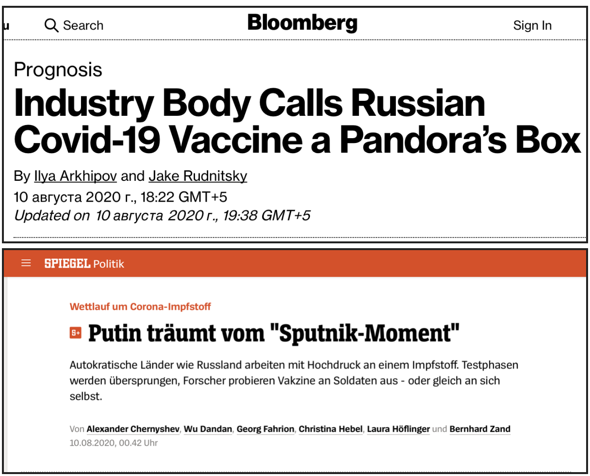 Der Spiegel (Германия): Путин мечтает о «моменте спутника». Автократические страны, в том числе Россия, усиленно работают над созданием вакцины против коронавируса. При этом некоторые фазы испытаний игнорируются, ученые проверяют вакцины на солдатах и на самих себе.