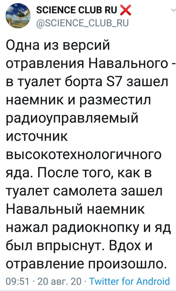 Журналист Андрей Малосолов: "Его компромат большей частью состоял из сливов одной башни на другую. Это называется медиарейдерство... Навальный до 2 ночи крепко выпивал в Томской области, заказал китайской еды из ресторана. По видео из аэропорта можно проследить буквально весь его путь до трапа самолета и уточнить, где ел, где пил перед вылетом. Уже говорят, что выпил на борту снотворное, возможно из-за боязни летать, и здесь вопрос - совместима ли химическая реакция препарата с алкоголем. До 2 ночи пить, а утром лететь — алкоголь на тысячу процентов не выветрится полностью. Ещё момент, вокруг Алеши скачут все врачи Омска, готова вылететь бригада из Москвы. Так лидеров оппозиции не ликвидируют. Если что, у Навального 24 августа суд по делу об оскорблении ветерана. Может в этом дело, ведь можно получить срок, и пациенту важно соскочить с процесса? Тоже небесспорная, но версия".