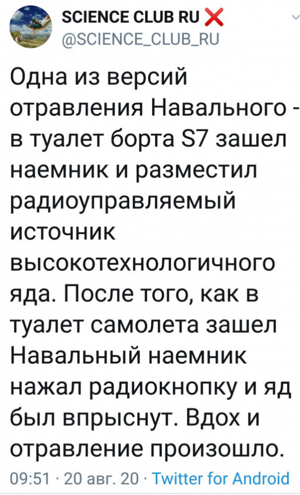 Журналист Андрей Медведев: "Отравление в российской оппозиции это такой местный формат #metoo. После Скрипалей об отравлении спецслужбами заявляли: Петя Верзилов — скорее всего, перемудрил с наркотиками, буквально через пару недель после «отравления» уже светился с водочкой в инстаграме, обещал представить железные доказательства отравления, но так и запамятовал. Дмитрий Быков (в миру Зильбертруд) — на гастролях переусердствовал с водочкой и жирными закусками, заработал предынсультное состояние или даже микроинсульт, заголосил об отравлении, был спецбортом отправлен в Москву, следов отравления так и не нашли. Теперь вот очередь Алексея нашего Анатольевича".