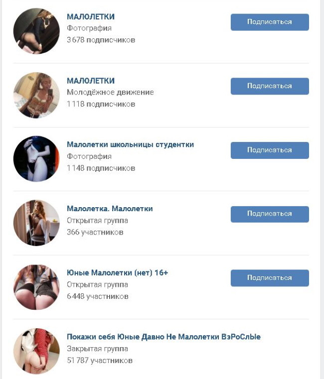 Не интересна «ВКонтакте» и педофилия. По крайней мере, по запросу «малолетки» вылезают сотни сообществ, которые как бы даже не намекают, а кричат открытым текстом. И да, зайдя в одну из групп, мы убедились, что там точно не про уроки.