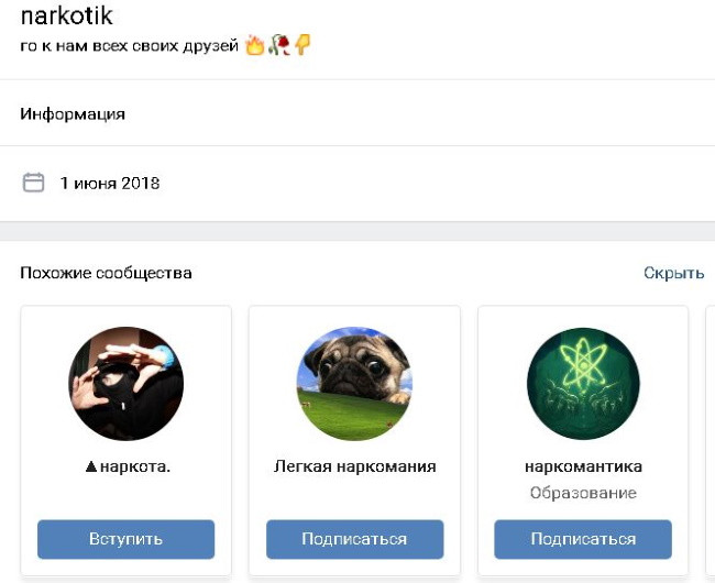 Далее вбиваем слово «наркотики» и попадаем в тематическое сообщество с соответствующим названием и широким выбором.