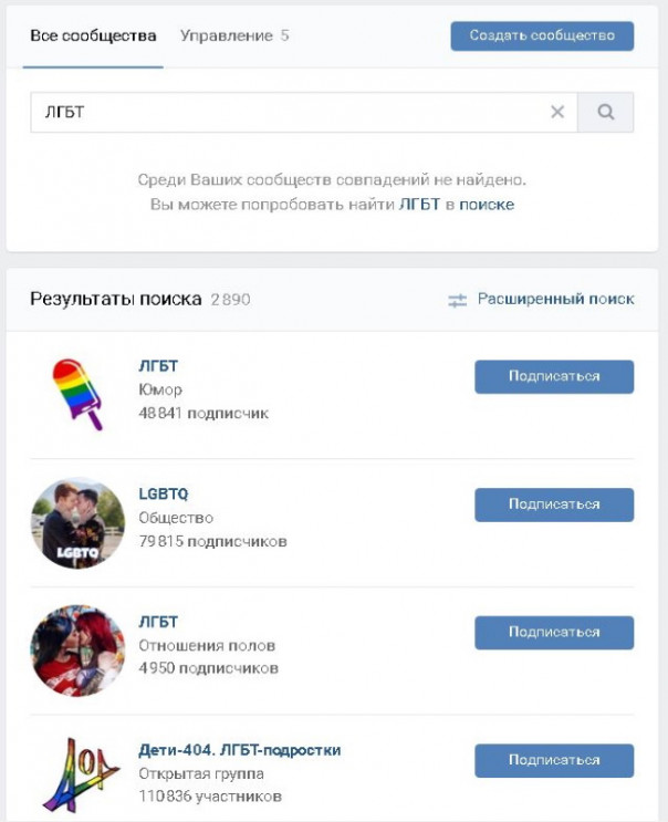 Вот несколько примеров. Начнем с пропаганды извращений, которая вообще никак не блокируется «нашей» соцсетью, хотя это незаконно. Достаточно вбить саму аббревиатуру «ЛГБТ» (так обозначают себя сами извращенцы) в поисковик сообществ — и мы получим около 3-х тысяч пабликов и групп, большинство из которых открыто и доступно для детей, а некоторые для детей и созданы.