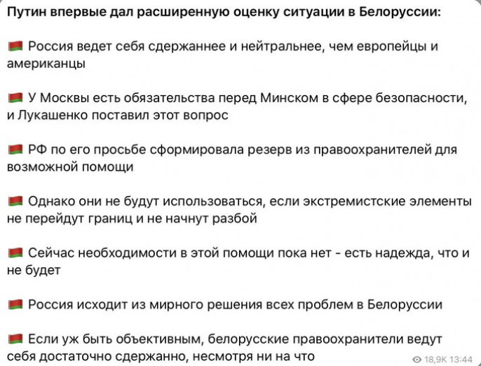 Путин: "На мой взгляд, мы ведём себя гораздо более сдержанно и нейтрально по отношению к событиям в Белоруссии, чем многие другие страны, и европейские, и американцы... Считаем, что это прежде всего дело самого белорусского общества, белорусского народа. Но нам, безусловно, не безразлично, что там происходит. Это очень близкая, самая близкая к нам страна: и этнически самая близкая, и в языковом плане, и в культурном, в духовном, каком угодно. У нас десятки, может, сотни тысяч, если не миллионы прямых родственных связей, теснейшая кооперация в промышленности... Вы обратили внимание, что Конституционный суд Белоруссии вынес решение, что создание каких-то надконституционных, не предусмотренных Основным законом страны, органов, которые пытаются перехватить власть, абсолютно недопустимо. И с этим трудно не согласиться... Нет необходимости здесь что-то скрывать. Действительно, в рамках Союзного договора, Договора о Союзном государстве, и в рамках Договора о коллективной безопасности (ОДКБ) есть соответствующие статьи, которые говорят о том, что все государства — члены этих организаций, в том числе и Союзного государства, а там всего только два государства-участника, Россия и Белоруссия, — должны оказывать друг другу помощь и в защите суверенитета, внешних границ и в защите стабильности. Там так и написано. В этой связи, конечно, у нас есть обязательства перед Белоруссией, и Александр Григорьевич Лукашенко так и поставил вопрос. Он поставил вопрос о том, что хотел бы, чтобы мы оказали, при необходимости, ему соответствующую помощь. Я сказал, что Россия исполнит все свои обязательства. Александр Григорьевич попросил меня сформировать определённый резерв из сотрудников правоохранительных органов, и я это сделал. Но мы договорились также, что он не будет использован до тех пор, пока ситуация не будет выходить из-под контроля, и когда экстремистские, я хочу это подчеркнуть, элементы, прикрываясь политическими лозунгами не перейдут определённых границ и не приступят просто к разбою: не начнут поджигать машины, дома, банки, пытаться захватывать административные здания и так далее. Мы в разговоре с Александром Григорьевичем пришли к выводу о том, что такой необходимости сейчас нет, и надеюсь, её не будет, и поэтому этот резерв мы и не используем. Повторяю ещё раз, мы исходим из того, что все сложившиеся проблемы, которые имеют место сегодня в Белоруссии, будут решаться мирным путём, а если где-то есть нарушения со стороны кого бы то ни было: либо со стороны государственных органов власти, правоохранительных органов, либо со стороны тех, кто участвует в акциях протеста, — если они выходят за рамки действующего закона, то и закон будет соответствующим образом на это реагировать. Ко всем закон должен относиться одинаково. Но если быть объективным, то я думаю, что правоохранительные органы Белоруссии ведут себя достаточно сдержанно, несмотря ни на что... Дело не в том, что происходит в Белоруссии, а дело в том, что кому-то хочется, чтобы там происходило что-то другое. Хотят влиять на эти процессы и добиться каких-то решений, которые соответствуют, как думают эти люди, их политическим интересам... В целом ситуация сейчас выравнивается".