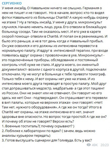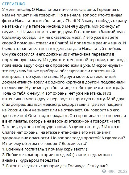 Сергиенко узнал об этом от своего друга, госпитализированного туда же еще до заварушки с Алексеем. И вот непонятно, почему Германия прячет либерала, и что с ним там вообще такое. Складывается ощущение, что никакого Навального в «Шарите» и в помине нет. А значит – информация, поступающая из клиники о состоянии Алеши – ложь.