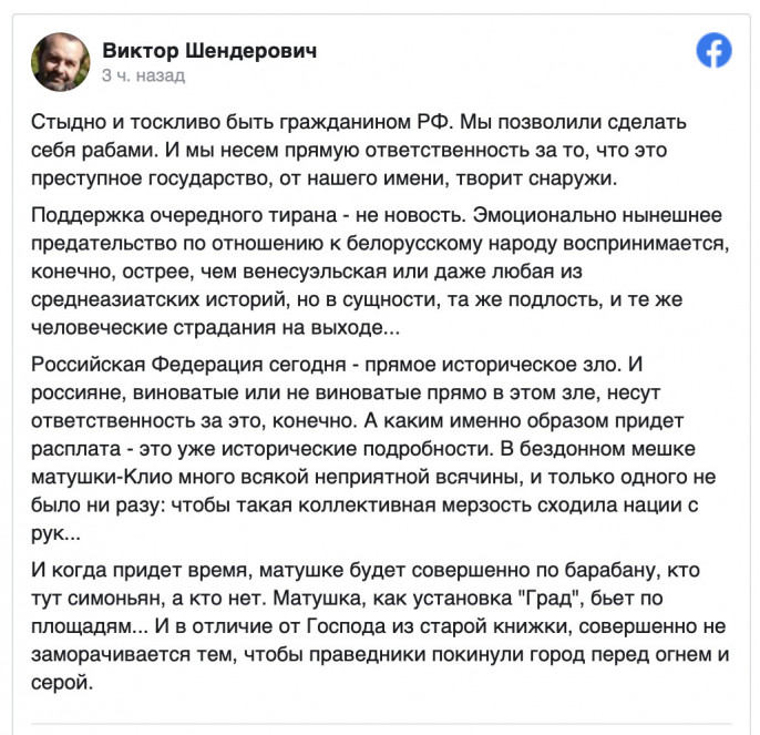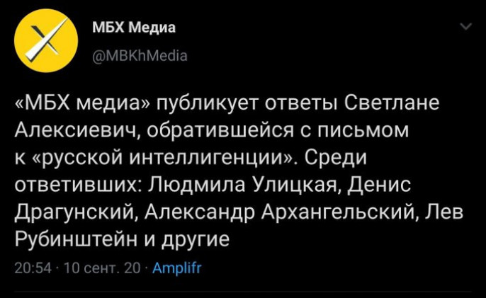 Александр Николаевич Архангельский (телеведущий, литературный критик, председатель либеральной Ассоциации "Свободное слово", профессор ВШЭ): "Дорогая Светлана, конечно, мы не можем молчать, да и не молчим, хотя голоса не всегда проходят сквозь шумовую завесу. Трудно (да и возможно ли в принципе) найти сколько-нибудь умного, как минимум вменяемого человека, который не был бы солидарен с народом Беларуси и не презирал пародийного диктатора, лжеца, насильника, губящего страну, разлагающего государство и унижающего граждан. Я верю, что у вас получится... И это будет новая страница в истории европейской свободы".