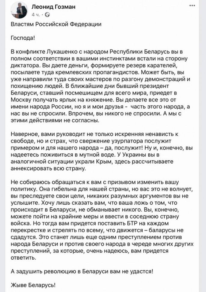 Лев Семёнович Рубинштейн (поэт-концептуалист, соучредитель Конгресса интеллигенции): "Дорогая Светлана! Мне тоже, как и многим, хочется ответить на ваше встревоженное и горькое послание... В эти дни на улицах и площадях вашей страны мы наблюдаем величественное, трагедийное, бесконечно завораживающее зрелище. Мы видим народ, а не население, которое мы, к сожалению, видим вокруг себя... На первый или на второй день многолюдных протестов в Минске и в других белорусских городах я по свежим впечатлениям записал на своей страничке в Фейсбуке: «Беларусь: горизонтальная женская революция. Пусть у них получится!». У вас получится, я уверен. Вы победите, радуя друг друга и побеждая самих себя. Может быть, не сегодня и даже не завтра, но обязательно. Дорогая Светлана! Если моё послание дойдёт до вас, ещё раз примите от меня слова солидарности и восхищения".