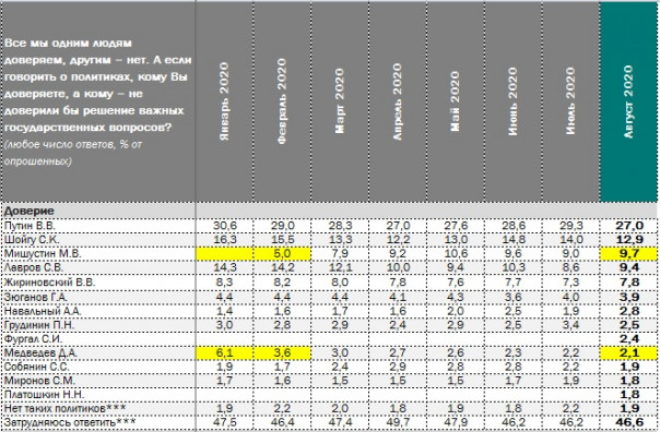 Действительно, как же это непонятно и печально. Правда и с чего бы это проценты Медведева так упали?..Крах ЕдРа, не иначе. Но я прошёл по ссылке и посмотрел исходную таблицу по месяцам 2020 года. Чтоб долго не разжёвывать куда же это запропастилось доверие Медведеву - выделил цветом.