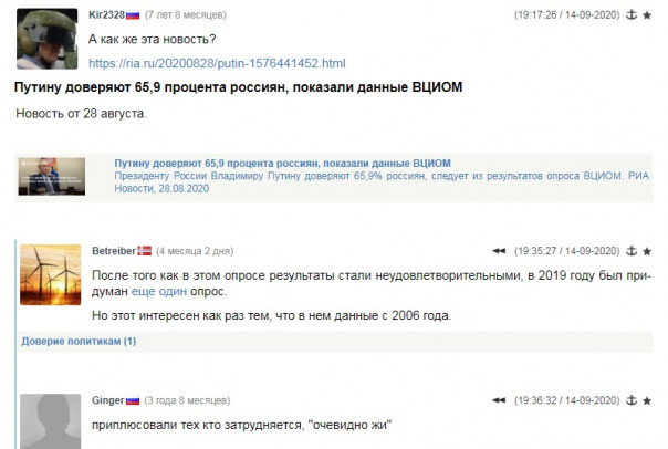 Первый- ленится разобраться самостоятельно (в том что сравнивает качественно, заведомо несопоставимые вещи). Второй- идёт дальше. И, изображая непонимание разницы опросов, вообще включает конспирологию. По его "логике" вместо (!) рейтинга доверия услужливый ВЦИОМ специально выдумал спросить "Доверяете ли конкретно Путину? Да/Нет". В "логике" этого персонажа просьба перечислить одно или несколько любимых блюд (любых) - наверное то же самое, что спросить любите вы или нет конкретно жареную картошку. Ну и наконец, третий персонаж подключил ещё и блестящее чувство юмора, пошутковав про то как ВЦИОМ записал всех отказавшихся отвечать на опрос в доверяющих Путину. Ну и какая разница что речь о заведомо, методологически, качественно несопоставимых опросах! Когда хочется ярко поиронизировать над властью такие вещи как логика и знание не должны служить препятствиями!