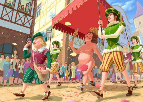 Король и его придворные замечают, что сами не в состоянии увидеть обновку, однако боятся в этом признаться, чтобы не прослыть дураками. Таким образом, король расхаживает голышом, и все восхищаются его новым превосходным костюмом".