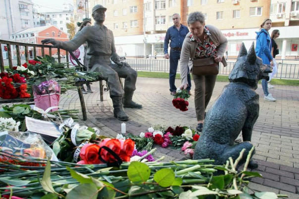 Цветы и свечи на месте гибели журналистки Ирины Славиной возле здания ГУ МВД России по Нижегородской области