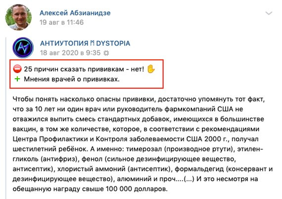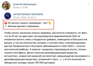 Глава петербургского отделения «Альянса» свидетелей окулиста Навального, выдавая себя за медика (врача-ортопеда и врача-травматолога), систематически постит в соцсетях призывы к отказу от прививок и является упоротым ковид-диссидентом. Будучи убежденным антимасочником, Абзианидзе также истово верит в теории мирового заговора и убеждает своих читателей, что коронавирус придумали главы нескольких мировых держав ради достижения собственных экономических целей.