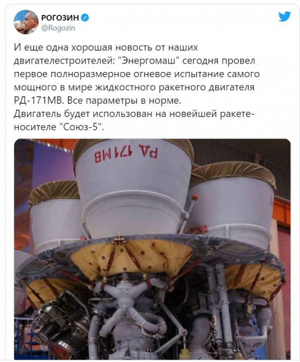 "Энергомаш" сегодня провел первое полноразмерное огневое испытание самого мощного в мире жидкостного ракетного двигателя РД-171МВ. Все параметры в норме", - написал Рогозин в своем аккаунте в Twitter.