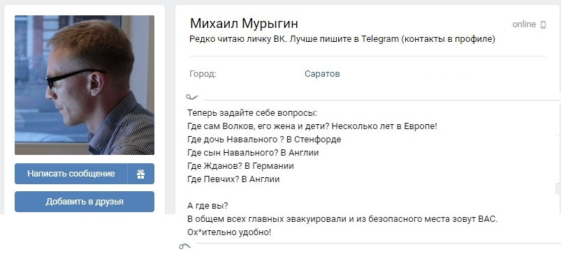 Саратовский координатор штаба Навального Михаил Мурыгин написал длинный пост во «ВКонтакте» с разоблачением Волкова и других навальнистов, призывающих выходить на несогласованные протесты 31 января. Парень рассказал о причинах, побудивших клоаку Навального «шатать власть», а также о том, как «борцы с коррупцией» кинули его самого на полмиллиона.