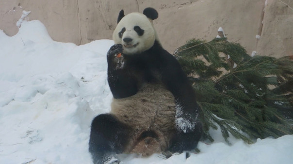 Смышленная Диндин поняла, что горка, покрытая снегом, может служить достойной площадкой для катания. Затем панда повалялась в снегу, радуясь его обильному слою.