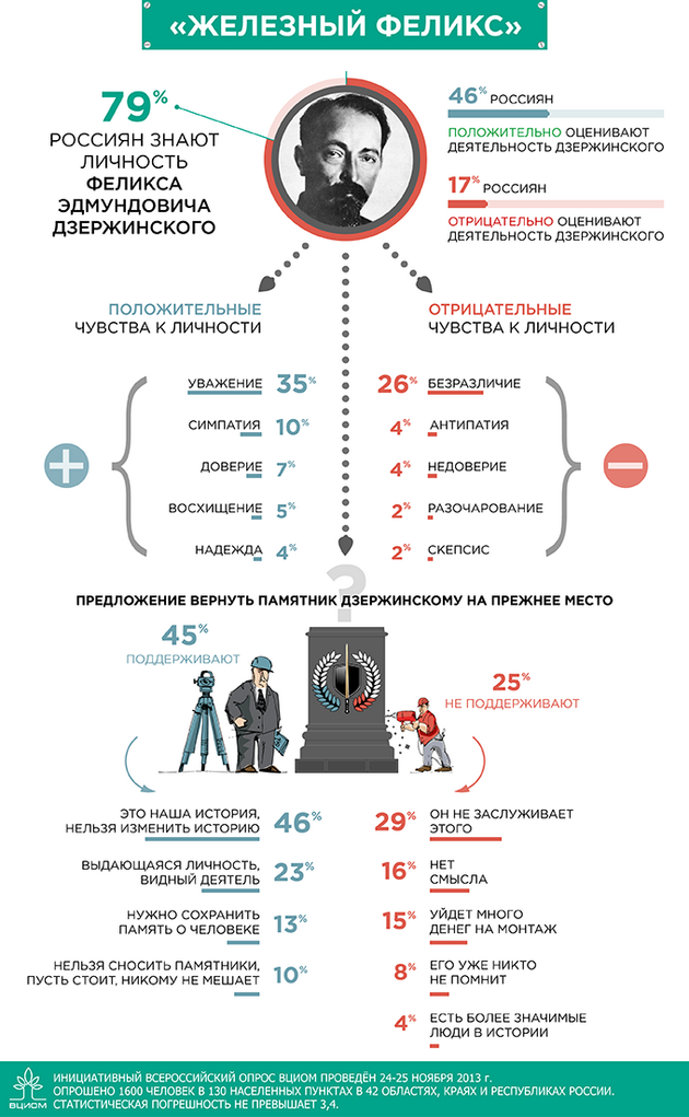 Как видно из опроса ВЦИОМ 2013-го года, к деятельности Дзержинского относятся положительно почти половина опрошенных, а это в 3 раза больше, чем тех, кто относится отрицательно.
