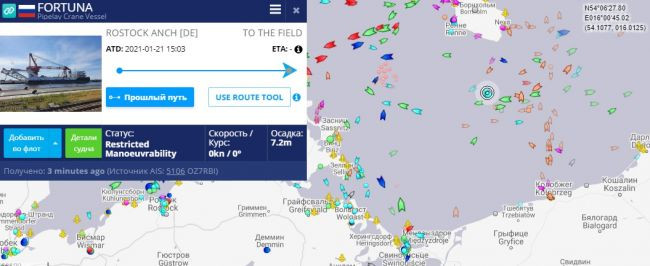 По данным навигационного портала Marinetraffic, трубоукладочная баржа «Фортуна» уложила за последние сутки 1100 метров газопровода и продолжает работы. Ранее судно строило до тысячи метров в день. Однако работать в таком темпе из-за погоды и необходимости переставлять якоря «Фортуна» может не каждые сутки. Так, судно встало на маршрут 6 февраля, однако потеряло не менее 10 дней из-за непогоды и перестановок.