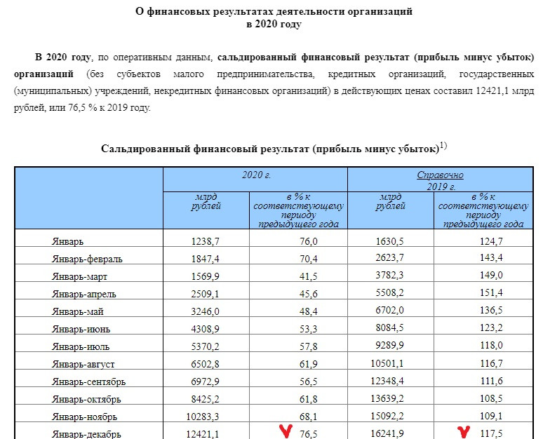 О направленности динамики показателя мы можем предварительно судить по данным Росстата о балансе прибылей и убытков компаний за 2020 год. Да, здесь не учитываются данные по малому бизнесу и финсектору, но тем не менее. Общая картина будет вполне ясна: