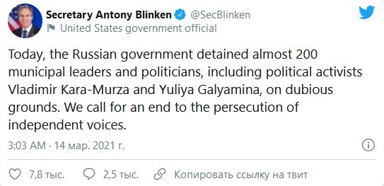 «Сегодня российские власти задержали почти 200 муниципальных лидеров и политиков, в том числе политических активистов Владимира Кара-Мурзу и Юлию Галямину, на сомнительных основаниях», — написал по этому поводу госсекретарь США Энтони Блинкен.