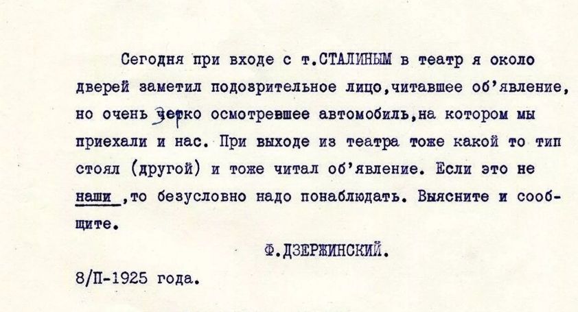 "Сегодня при входе с т. Сталиным в театр я около дверей заметил подозрительное лицо, читавшее объявление, но очень зорко осмотревшее автомобиль, на котором мы приехали, и нас. При выходе из театра тоже какой-то тип стоял (другой) и тоже читал объявление. Если это не наши, то, безусловно, надо понаблюдать. Выясните и сообщите", — указывал Дзержинский.