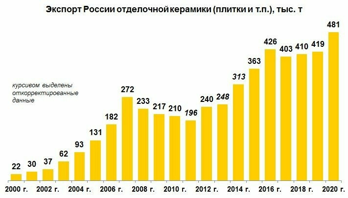 Экспорт облицовочной плитки и другой отделочной керамики в 2020 г. вырос на 15% до 481 тыс. т. Это новый исторический максимум, прежний пик — 426 тыс. т в 2016 г. В стоимостном выражении экспорт составил 152 млн долл. (+3,1%).