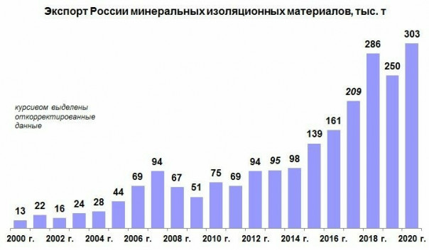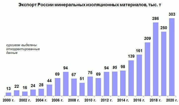 Экспорт минеральных изоляционных материалов в 2020 г. вырос на 21% до 303 тыс. т. Это новый исторический максимум, превзошедший пик 2018 г. (286 тыс. т); по сравнению с 2014 г. поставки более чем утроились. В стоимостном выражении экспорт составил 118 млн долл. (-1,5%). Россия в 2020 г. впервые поднялась на второе место в мире по экспорту минеральных изоляционных материалов, разделив его с Польшей и уступая только Германии, и сохранила за собой второе место по экспорту минеральной ваты (249 тыс. т), немного уступив Польше.