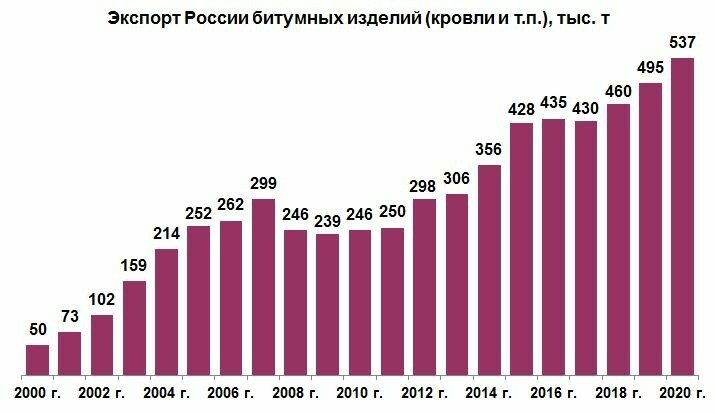 Экспорт битумной кровли и схожих изделий на основе битума в 2020 г. вырос на 8,3% до 537 тыс. т. Это очередной исторический максимум, за последние 10 лет поставки лишь однажды не показали роста. В стоимостном выражении экспорт составил 193 млн долл. (+0,4%). Россия, опередив США, вышла на первое место в мире по экспорту битумной кровли и схожих изделий. При этом если у США в 2020 г. на самый удобный рынок (Канаду) было направлено 78% поставок, то у России в ЕАЭС — только 17% (в СНГ в целом — 34%).