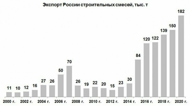 Экспорт строительных смесей в 2020 г. вырос на 21% до 182 тыс. т. Это очередной исторический максимум, рост происходит восьмой год подряд. В стоимостном выражении экспорт составил 61,1 млн долл. (+4,2%). В 2020 г., по оценке, Россия впервые вошла в десятку ведущих экспортёров строительных смесей.