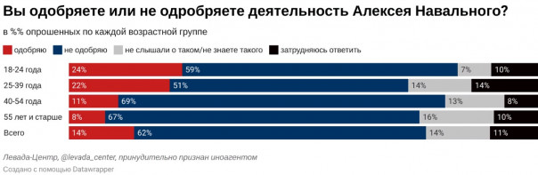 Среди тех, кто одобряет деятельность президента, лишь 6% одобряют Алексея Навального, 71% – не одобряют. Среди тех, кто не одобряет деятельность Владимира Путина, 30% одобряют деятельность Навального, 45% – не одобряют.