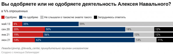 Так что особенно интересно, что за первое полугодие 2021 все переставшие одобрять деятельность Навального ушли вовсе не в равнодушные ("забывшие"), а именно в активно неодобряющие. Антирейтинг деятельности Навального официально достиг исторического пика (точнее - дна).