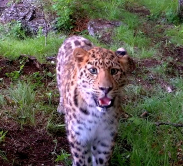 На видео попал самец возрастом около полутора лет. Сначала пятнистый хищник направляется в сторону фотоловушки, внимательно смотря по сторонам. Приблизившись к камере, он замечает её и на несколько секунд задерживается, с любопытством осматривая незнакомый объект. Выглядит так, будто он намеренно позирует для фото – хищник выбрал удачный ракурс и улыбнулся в камеру.