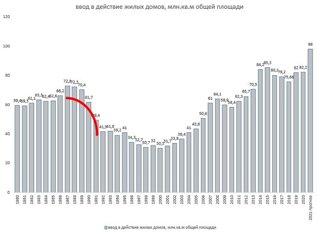 Приблизительно, в 1917 году на 90 млн человек приходилось по 8 кв. метров. или 0,72 млрд. кв. метров общей площади жилья. То есть, без учета вышедшего из эксплуатации жилья, в РСФСР за 73 года добавили 1,73 млрд. кв. метров жилья. примерно по 23,7 млн метров в год. За 20 лет путинских лет , без учета вышедшего из эксплуатации жилья, уже построили 1,2 млрд. кв. метров жилья, а скорость строительства со средних советских 30 млн метров в год, выросла в 3 раза.