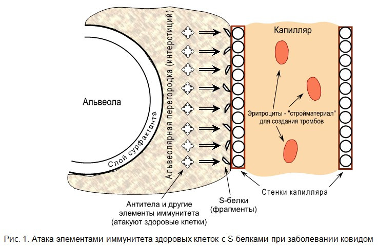 ЭТАП 5. Аутоиммунная реакция, когда созданные элементы иммунной Системы начинают уничтожать здоровые клетки организма, на которых были обнаружены фрагменты разрушенных коронавирусов, в основном – S-белки. Следствием наличия и обнаружения на стенках капилляров S-белков и прочих фрагментов коронавирусов является масса пробоин капиллярных сосудов извне (см. рис.1). А именно: антитела и другие элементы иммунитета пробивают стенки капилляров, вызывая МАССОВОЕ ТРОМБООБРАЗОВАНИЕ со стороны Системы гемостаза - одной из защитных систем организма (для закрытия данных пробоин).