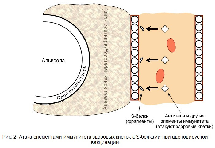 В результате введения аденовирусной вакцины образуется множество S-белков или их фрагментов. Часть из них оседает на внутренних стенках кровеносных сосудов. Образованные антитела и другие элементы иммунитета не только уничтожают антигены, находящиеся в крови, но и начинают атаковать здоровые клетки стенок сосудов, на которых обнаружены S-белки. То есть происходит та же самая аутоиммунная реакция организма, что и при ковиде, но в облегченном варианте (рис. 2). Облегченном, т.к. с одной дозы вакцины S-белков получается намного меньше, чем при цитокиновом шторме в процессе тяжелого ковид-заболевания. Кроме данного количественного показателя все остальные условия “русской рулетки” с образованием тромбофилии остаются в силе. Понятно, что отверстие в трубе (кровеносном сосуде), сделанное извне (при ковиде) или изнутри (при вакцинации), сути события не меняет...