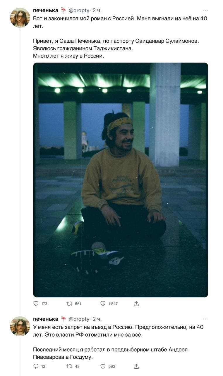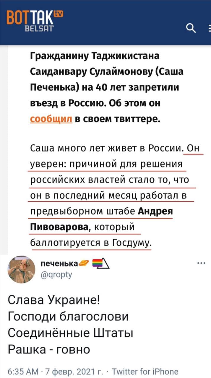 Всем привет. Я гражданин Таджикистана. Я очень люблю Россию, но считаю её власть оккупантами. Также я поддерживаю разных упырей, работающих на беглых олигархов, цель которых развалить Россию. Я не понимаю, почему меня выгнали из страны на целых 40 лет!