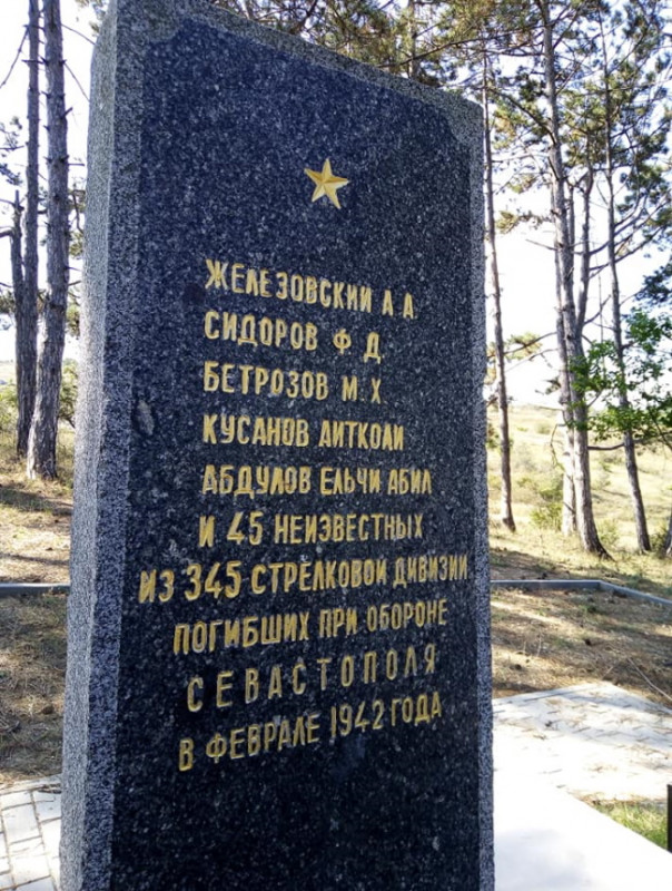 Этот самый холм являл собой последний рубеж для полусотни солдат, призванных удержать натиск рвущегося к Севастополю врага. Тогда враг решил использовать перешедших на сторону фашистов местных татар. Глухой ночью, в часы затишья между боями, татары пробрались в расположение взвода, сняли часовых и вырезали спящих в овраге бойцов. Двадцать с лишним лет спустя, в 1964 году, школьники села Фронтовое обнаружили на вершине холма котлован и присыпанные землей останки солдат 345-й дивизии. Даже в последний час они держали круговую оборону, лёжа по краю котловинки, успевшей за долгие годы порасти молодым леском.