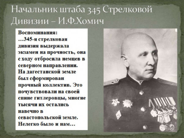 345-я дивизия выдержала экзамен, она с ходу отбросила немцев в северном направлении. На дагестанской земле был сформирован прочный коллектив. Это почувствовали на своей спине гитлеровцы, многие тысячи их остались навечно в севастопольской земле. Нелегко было и нам…»