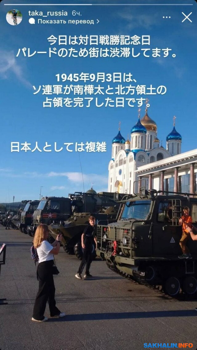 Сотрудник генерального консульства Японии в Южно-Сахалинске Адати Такаюки, посетивший 3 сентября торжества в честь Дня Победы над Японией в Южно-Сахалинске, поделился впечатлениями на своей странице в Instagram, где написал следующее: “Сегодня – день победы над Японией. По причине проведения парада город в пробках. 3 сентября 1945 года – день, когда советская армия завершила оккупацию Южного Карафуто и Северных территорий. Для японцев это сложный день”.