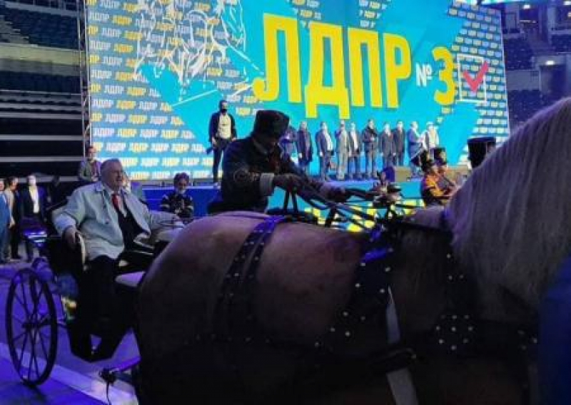 Лидер ЛДПР, депутат Госдумы РФ Владимир Жириновский на заключительный предвыборный съезд партии на ВТБ-Арене приехал в коляске, запряженной тройкой лошадей.
