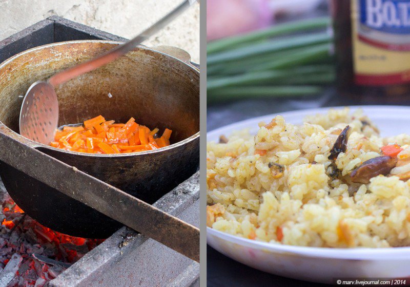 Дальнейший процесс я слегка пропустил, но если в двух словах, то рис пошёл в тот же казан и накрылся крышкой. Вот здесь был небольшой промах. Крышки под казан у нас не было, пришлось экспериментировать. Да, неправильно, но что поделаешь. Отказываться от плова который ещё неизвестно когда снова попробуешь из-за крышки, было бы глупо.