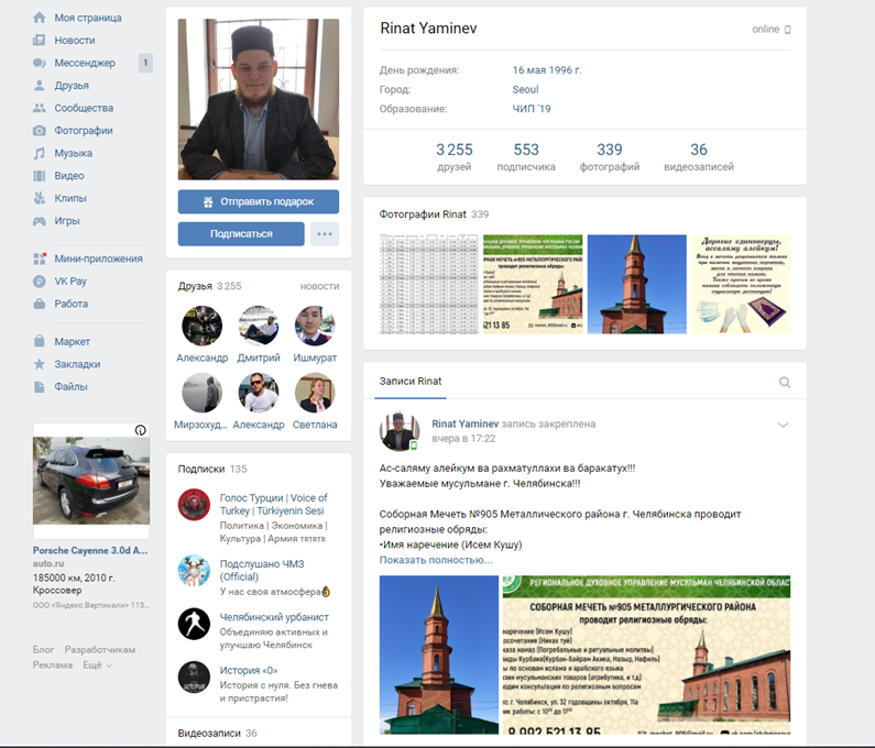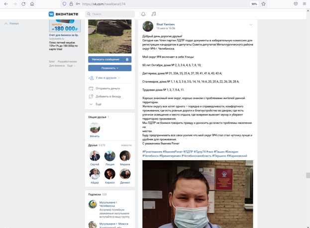 Перед подачей заявления для набора голосов решил использовать мусульманское сообщество региона. Создал страницу в социальной сети «Вконтакте», где от имени якобы сотрудника мечети № 905 г. Челябинска начал размещать информация о событиях, происходящих в исламском мире. В целях наибольшего пиара и отклика со стороны челябинских мусульман активно размещал на своей странице тенденциозные материалы от призывов не покупать французские товары из-за высказываний президента Франции относительно ислама до призывов не заключать браки с представителями других религий. В ноябре 2020 года разместил разжигающий межнациональную и межконфессиональную вражду пост, о последствиях конфликта в Нагорном Карабахе, не имеющего никакого отношения к челябинским мусульманам, а также проживающим в регионе выходцам из армении и азербайджана.
