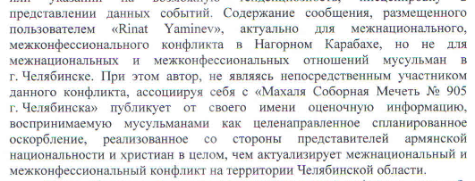 То, что страница Яминева была открыта для свободного доступа следует также из материалов административного дела, занесено в протокол судебного заседания и отражено в решении Челябинского областного суда. (В марте 2021 года по инициативе прокуратуры г. Челябинска, Тракторозаводским районным судом он признан виновным в совершении административного правонарушения по ст. 20.3.1 КоАП России.) Очередная ложь Яминева связана с его заявлением о том, что он скопировал размещенный на его странице текст. Однако если это проверить опытным путем и фразу, размещенную Яминевым «загуглить», то ничего подобного ни один поисковик нам не выдаст. То есть позиция эксперта, о том, что комментарии и фото были размещены Яминевым самостоятельно и являются его личной точкой зрения на конфликт в Нагорном Карабахе сомнению не подлежит.