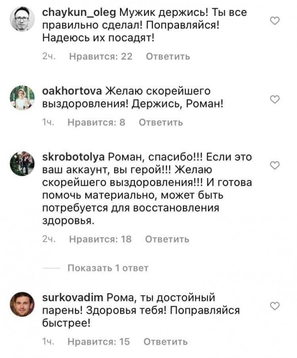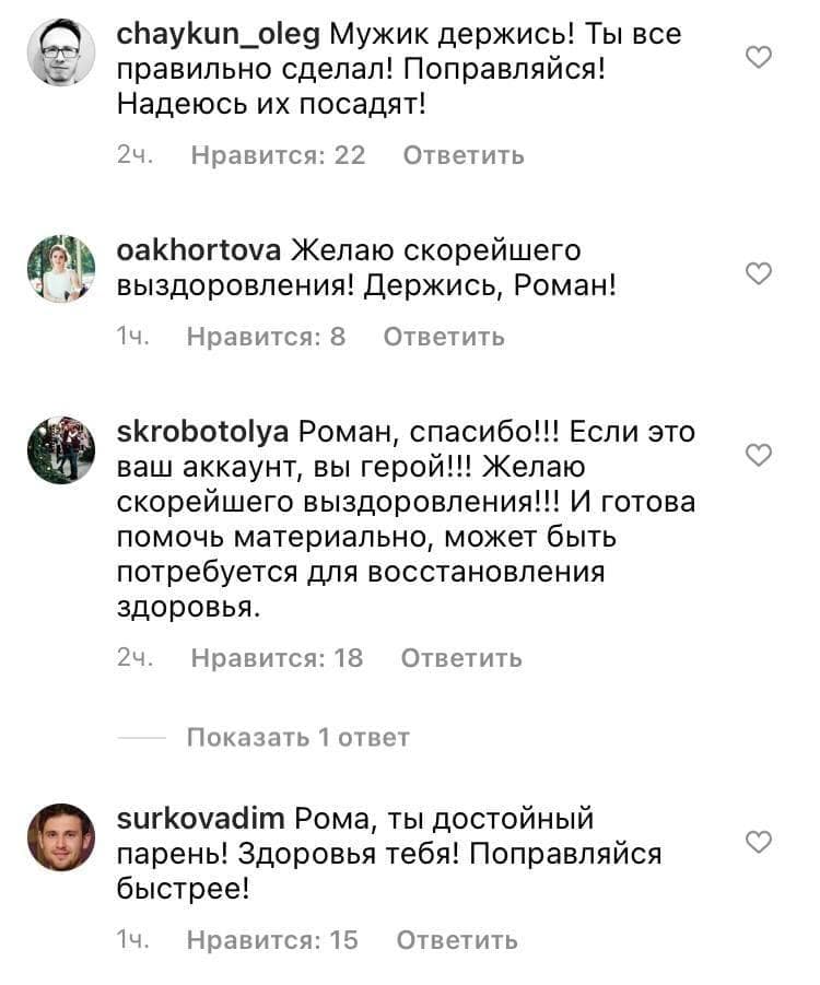 Пользователи Instagram пишут слова поддержки Роману Ковалёву, которого 4 октября избили в метро, когда он заступился за девушку. Люди желают ему скорейшего выздоровления и благодарят: