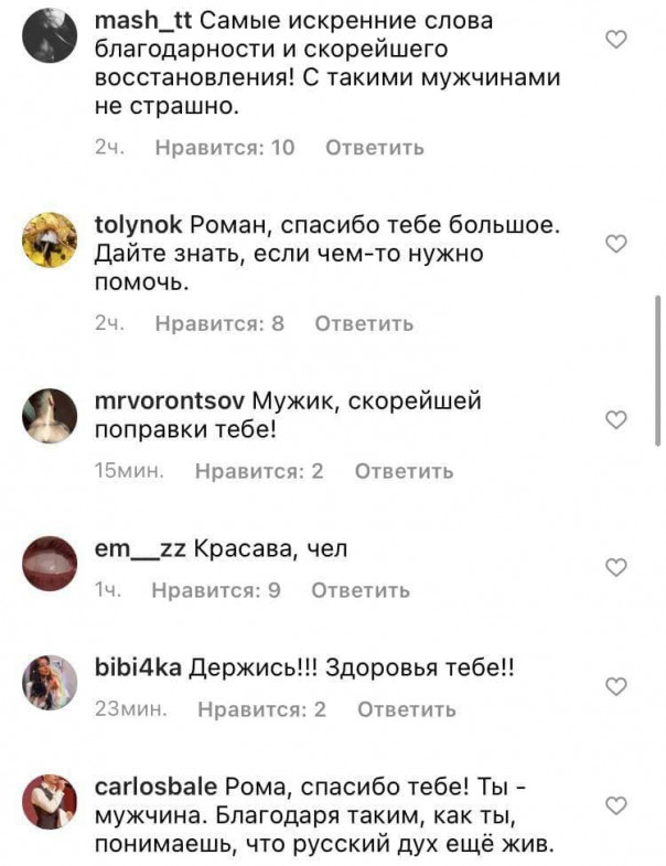 «Роман, спасибо! Вы герой! Желаю скорейшего выздоровления! И готова помочь материально».